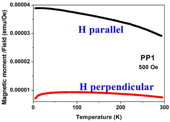 The temperature dependence of the susceptibility (m/H) under applied fields of 500 Oe measured parallel and perpendicular of PP1 sample.