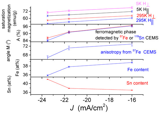 The dependence of the saturation magnetization on deposition current density of the PP deposited alloys (Figure 17) differs significantly from the dependence of the DC deposits shown in Figure 16. The saturation magnetization first increases and then shows a decreasing dependence on the current density for both 5 K and 295 K measurements both in perpendicular and in parallel field. This dependence shows a similar trend with the ferromagnetic phase content derived from the 57Fe CEMS measurements, thus confirming that the saturation magnetization mainly reflects the occurrence of the ferromagnetic phase. However, the change in saturation magnetization does not correlate with the change in ferromagnetic content determined by 119Sn CEMS, suggesting that the precipitation of the tin-containing phases and thus the formation of a short-range order are different from that of the DC deposits. This is also supported by the fact that the iron content and the saturation magnetization change similarly, while the tin content thus depends inversely on the current density. Furthermore, the current density dependence of the anisotropy obtained by the Mössbauer measurement is not similar to the current density dependence of the saturation magnetization, suggesting that the anisotropy detected by the magnetic measurements may not be influenced by the change of a few degrees in the average direction of magnetization in the studied range, which again may be due to differences in the structure of the PP and DC deposits.