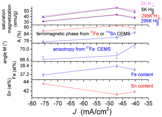 The dependence of the saturation magnetization of the DC-plated alloys (Figure 16) on the deposition current density shows a monotonically increasing dependence in both 5 K and 295 K measurements in perpendicular and parallel fields. This dependence shows a similar trend with the occurrence of the ferromagnetic phase, determined from the 57Fe and 119Sn CEMS measurements. This correlation, especially with those obtained from the 57Fe spectra, suggests that the saturation magnetization largely reflects the occurrence of the ferromagnetic phase. This is not surprising because in some steels with ferromagnetic and paramagnetic phases, the saturation magnetization is also used to measure the occurrence of the ferromagnetic phase [35]. As shown in Figure 16, the magnetization changes directly with the iron content, while also changing inversely with the tin content. This can be explained by the fact that as the absolute value of the current density increases, deposits with a higher tin content can be produced, in which a paramagnetic phase is formed to a greater extent. The existence of magnetic anisotropy in the DC deposits is clearly reflected in the differences between the saturation magnetizations obtained for fields applied perpendicularly and in parallel. A correlation can be observed at the same time between the saturation magnetization and the average direction of the magnetization, characterizing the shape anisotropy, derived from the 57Fe CEMS measurements, which may suggest that this may also play a role in the value of the saturation magnetization. A correlation of the saturation magnetization with the thickness of the deposit (Table 2) can also be possible, but in the case of the PP deposits (Figure 17), it seems to be more complex.