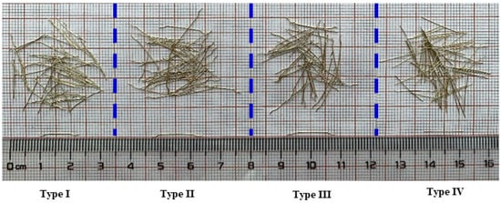 Additionally, four types of brass-coated steel fibers were incorporated into the matrix in this study, as listed in Table 1 and shown in Figure 1. Three types of hooked-end steel fibers with various aspect ratios (lf/df) of (59.09 for Type I, 72.73 for Type II and 64.00 for Type III), and one type of straight fiber (Type IV) with a length of 13 mm, and diameter of 0.20 mm were used.