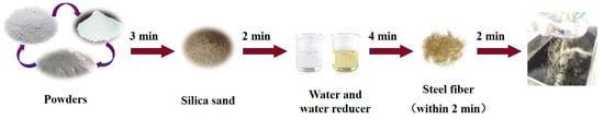 The UHPC mixture proportions in this investigation are summarized in Table 2. Specially, fiber volume content was neglected in the mix proportions. As illustrated in Figure 2, the same mix procedure was adopted for all mixtures. The dry powders (i.e., cement, silica fume and Nano-CaCO3) and silica sand were premixed before adding the water and water reducer. The materials were mixed for another 4 min to give the mixture enough fluidity. Afterwards, steel fiber was added by passing a sieve to ensure proper dispersion. Specially, the unit weight and flowability recommended by ASTM C1437-15 for fresh concrete were also tested [33]. A layer of fresh concrete about 25 mm in thickness was place in the mold at the center of the flow table and tamped. The table was immediately drop 25 times in 15 s once lifting the mold away [33]. All specimens were demolded at about 24 h after casting and then cured in a moist condition for the next 7 days. Finally, all specimens were placed outside the laboratory for natural curing until the testing day (generally 28 days after casting).