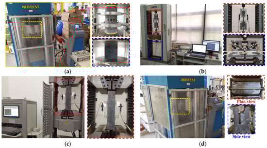Test setup and instrumentation: (a) compressive test; (b) direct tensile and four-point bending tests; (c) axial tensile test; (d) splitting tensile test.