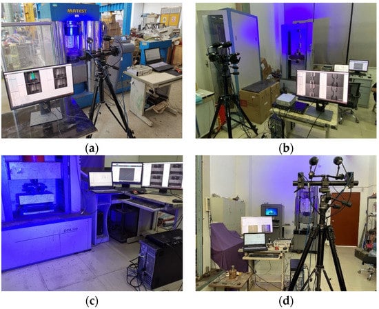 Digital Image Correlation (DIC) is a non-destructive non-contact optical monitoring technique, which could be used to analyze structural surface strains and crack development patterns [35]. Two cameras were used to take a series of grayscale digital images from two different angles aimed at the surface of the specimen. In addition, the strain and crack development patterns on the specimen surface were calculated by the 3D DIC software. In this study, speckle patterns were sprayed firstly on the surface of specimens (cylinders in compression, dog-bone-shaped specimens, and two types of prisms in four-point bending and axial tensile tests). Two high-resolution cameras which captured images every 1 s were positioned in front of the specimens. In addition, two blue lights were used to avoid the effect of frequent blinking light on the specimens (Figure 5).