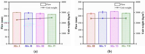 Flowability and unit weight of fresh UHPC mixtures: (a) effect of fiber volume contents; (b) effect of fiber types.