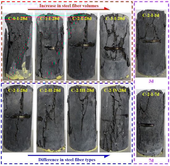 Figure 7 presents the typical failure patterns of the reference compressive specimens (ϕ100 × 200 mm2 cylinders), in which only vertical and diagonal cracks were observed. Taking specimen C-2-I-28d as an example, specimens C-2-I-28d experienced a significant load drop after the peak stress, accompanied by concrete cracking and steel fibers pulling out.