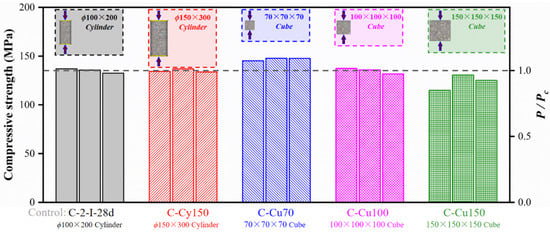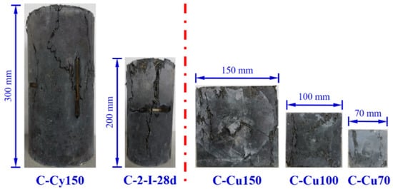 Typical failure patterns for specimens with different geometric dimensions are shown in Figure 8. Similar cracking patterns were obtained from cylinder compressive specimens with different dimensions (C-Cy150 and C-2-I-28d). However, brittle failure was prevented by fibers in ϕ150 × 300 mm2 cylinder specimens. As for cubes with different dimensions, spalling lateral sides were transformed into columnar cracks due to the incorporation of fibers. Coincidentally, the failure patterns did not vary much with cube size.