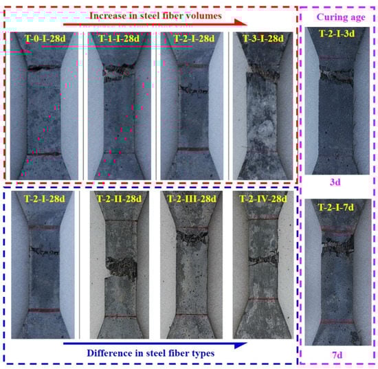 Figure 9 depicts the typical failure modes of the reference tensile specimens (dog-bone shaped specimens). Specimens without steel fibers showed rapid load drop once a visible crack appeared. As for specimens with steel fibers, a single and localized crack was observed when microcracks combine to form a macrocrack at the weakest section. Afterwards, strength started to decrease after the strain–harden stage with the macrocrack width increasing until failure. However, the ultimate tensile strength increased significantly as the fiber volume increased from 0 to 3%.