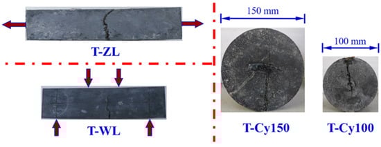 The typical failure patterns of tensile specimens with different geometric dimensions are shown in Figure 10. Due to the similar geometry and loading procedure with the reference specimens, axial tensile specimens (T-ZL) also presented a single crack. In addition, visible flexural cracks extending from the bottom to the side face were found in a four-point bending test (T-WL). As for the splitting tensile specimens with different sizes (T-Cy), specimens failed due to the local maximum strain in a single crack.