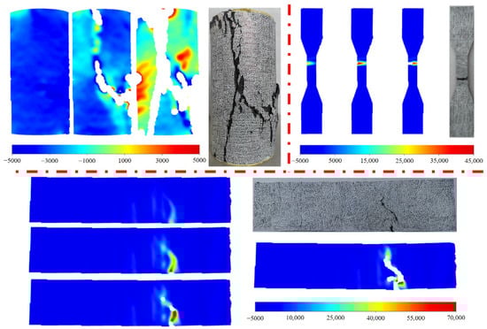 The strain cloud diagrams obtained from the DIC technology were compared with the failure patterns, as shown in Figure 11. Surface strains and crack development patterns of specimens depicted that the DIC technique could capture experimental data during the test. The surface strain of axial tensile specimens was incomplete due to the impact of bright light. However, the experimental results and previous studies depicted DIC-enabled the measurement of non-uniform surface displacement due to material heterogeneity and geometry that affected the shrinkage distribution which cannot be detected by traditional LVDTs [35,37]. Therefore, the technique can be used as an optional method to reflect the displacement and deformation of the specimens.