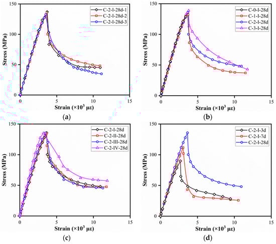 As shown in Figure 12a, specimens C-2-I-28d presented an almost linear ascending portion of the stress–strain compressive curves. The load capacity after peak stress dropped at high rates due to the appearance of macrocracks. Afterward, the rate of load decreasing decreased with the bridging effect of fibers and the redistribution of stress. For specimens with different fiber volume contents, a slight increase in the ultimate compressive strength before the cracks fully developed was obtained. The post-peak stage was obvious in specimens with fibers due to the energy absorption and stress redistribution provided by the fiber bridging effect. In contrast, a sudden load drop was observed in specimens without fiber, which related to the energy released with macrocracks developed rapidly after peak stress. In addition, higher fiber content would lead to higher residual strength. For a given fiber content, specimens with hooked-end fibers tended to exhibit insignificant differences in stress–strain curves, while those with straight fiber showed lower peak strain (strain corresponding to peak stress) but higher residual strength. This may be related to larger slipping occurred between the straight fiber and matrix material compared to hooked-end fibers, which could also be found in a single fiber pull out test conducted by Wille et al. [38]. Obvious difference was observed among specimens with various curing ages, as shown in Figure 12d. Larger post-peak load loss was measured for specimens tested at 7 days, which was also found by Hassan et al. [34]. The possible reason was that higher compressive strengths occurred in the matrix at 7 days, while the fiber bridging effect was not strong enough. Therefore, bonding between fiber and matrix could not ensure the redistribution of stress after peak stress.