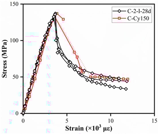 Additionally, ϕ150 × 300 mm2 cylinder specimens were tested to investigate the geometric dimension effect on compressive stress–strain curves. Comparison of stress–strain curves between control specimens (C-2-I-28d) and ϕ150 × 300 mm2 cylinder specimens (C-Cy150) are given in Figure 13. Several LVTDs of ϕ150 × 300 mm2 cylinder specimens were detached from the frame because of the sudden energy release at peak stress. Cylinders with different dimensions presented a similar compressive behavior, especially in the pre-peak stage. However, the descending portion of larger specimens was as steep as the ascending potion. Higher residual strength occurred in ϕ150 × 300 mm2 cylinders, which possibly attributable to the geometric dimension effect on the post-peak stage of compressive stress–strain curves.