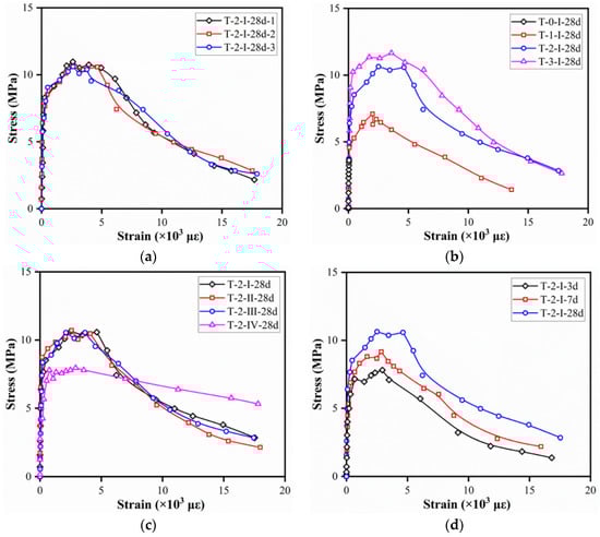 Typical compressive stress–strain curves (ϕ100 × 200 mm2 cylinders): (a) control specimens (C-2-I-28d); (b) fiber volume contents; (c) fiber types; (d) curing ages.