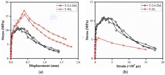 As shown in Figure 15a, tensile stress–displacement curves in the four-point bending test consisted of elastic phase, hardening phase, and softening phase. The deflection of prism specimens increased linearly until the formation of cracks. As the applied load rose, a linear inflection point was found at the beginning of the deflection hardening phase. However, high peak stress prior to the tension softening phase revealed a high energy ability occurred in prism specimens [16,39]. As for the axial tensile test, specimens failed rapidly after the stress exceeded the ultimate tensile stress of the matrix (3.64 MPa). It was attributed to the peak strain at the single crack location being greater than the ultimate limit strain of the matrix by Hassan et al. [34].