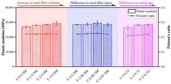 The method recommended by ASTM C496 [29] was adopted to obtain the elastic modulus and Poisson’s ratio of UHPC. The mean values of experimental results in compression are shown in Table 4. The effect of fiber volume content, fiber type, and curing age on the elastic modulus and Poisson’s ratio can also be found in Figure 16.