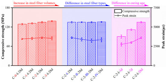 Figure 17 depicts the effect of fiber volume content, fiber type, and curing age on the measured ultimate compressive strength and corresponding strain of reference compressive specimens. The steel fiber volume content and type showed a very limited effect on the compressive performance of the specimens. Peak stress increased with the increase in steel fiber volume content. The peak stress of UHPCs using steel fibers with volume contents of 1%, 2%, and 3% were increased by 1.90%, 4.70%, and 7.32%, respectively, as compared to specimens C-0-I-28d. However, specimens with different fiber contents showed an insignificant difference in peak strain, which was mainly attributed to the negative effect of fiber volume content on flowability [40]. Moreover, specimens with different fiber types showed little variation both in compressive strength and peak strain. Peak strain of specimens with different fiber contents and types were measured to be about 3500 με. In addition, specimens exhibited massive differences due to the different matrix strengths at different ages. The average strengths measured at 3 and 7 days were 66.97% and 82.75% of those at 28 days, respectively. Furthermore, peak strain demonstrated a tendency to increase with curing age as well. Peak strains of specimens testing at 3 and 7 days were only 2751 and 2986 με, respectively, far less than 3612 με (C-2-I-28d).