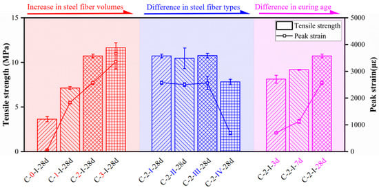 The mean values of tensile strength and peak train measured by dog-bone-shaped specimens are presented in Table 6 and Figure 19. The results revealed that the ultimate tensile strength and corresponding strain increased as fiber content and curing age increased. For specimens with different fiber contents, specimens T-3-I-28d exhibited the highest mean peak stress and corresponding strain, which increased by 220% and 5688%, respectively, compared to those without fibers. For the notched prism specimens axial tensile test, the increase in fiber volume content elevated the ultimate tensile capacity as well [12]. In addition, the mean peak stress and peak strain of specimens T-2-I-28d were increased by 32% and 267%, respectively, compared to those tested at 3 days. However, specimens with straight fibers showed lower strengths and strains than those with hooked-end fibers with the same fiber content.