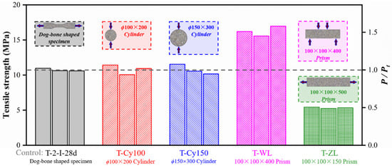 Tensile tests on a variety of specimens with different geometric dimensions were also conducted in this study, as presented in Table 7 and Figure 20. Compared with previous studies [13,24], more geometric dimensions of tensile specimens were considered in the study and more conversion factors were proposed. ϕ100 × 200 mm2 cylinders and ϕ150 × 300 mm2 cylinders showed similar splitting tensile strengths as compared with dog-bone-shaped specimens (T-2-I-28d). However, larger peak stress was obtained in the four-point bending test owing to more fibers being involved in the bridging effect as cracks developed. A mean flexural value of 16.24 MPa was measured, which was 1.51 times the mean strength of the control dog-bone-shaped specimens. Peak stress obtained from the axial tensile test (T-ZL) was half the result of the specimens T-2-I-28d, which might be explained by the larger dimension leading to random distribution of fibers. In addition, Wille et al. suggested that the small height and width of the specimen mold in comparison to a fiber length would lead to fiber alignment in the direction of the applied tensile [16]. Thus, fibers in the dog-bone specimen contributed more tension than those in prism specimens (T-ZL).