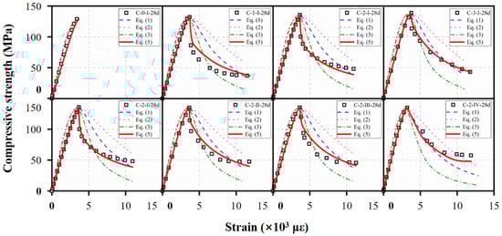 The prediction results of reference compressive specimens obtained from Equation (5) are presented in Figure 21. As discussed earlier, Equation (5) could describe accurately the pre-peak ranges of the curves. In addition, the descending portions were well predicted by Equation (5) for UHPC with different fiber contents and types.