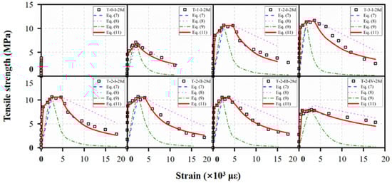The prediction of the above models was compared with the tensile stress–strain curves, as shown in Figure 22. Equation (7) showed large deviations in the pre-peak behavior, while presenting accurate prediction for the strain–softening portion. However, Equation (8) described the elastic phase accurately, while it exhibited insufficient prediction for the descending portion. Equation (9), which considered the peak strain but ignored the strain–harden stage, showed poor prediction for complete curves.