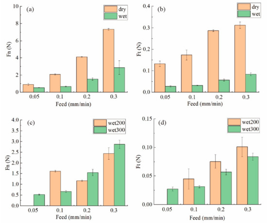The thrusting force and normal force for (a,b) dry cutting and wet cutting conditions; (c,d) wet cutting with 200 and 300 rpm spindle speeds.