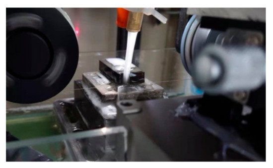 The cutting diamond wire had a diameter of 250 μm, with #300 diamond grits electroplated on the wire. A N48H NdFeB magnet, provided by Advanced Technology & Materials Co., Ltd., Beijing, China, was selected as the sample in this work, and it had a size of 30 × 30 × 10 mm. During the cutting process, an ST12 water-based cutting fluid was supplied to the sample.