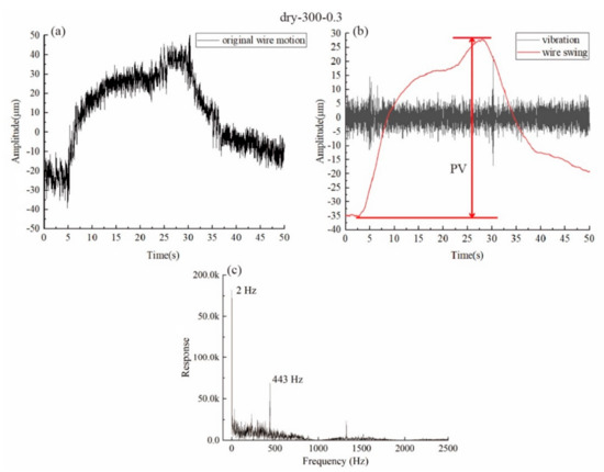 (a) The original wire motion; (b) the extracted vibration component and wire swing curve; (c) the frequency domain response for the original wire motion curve.