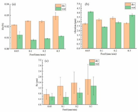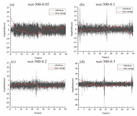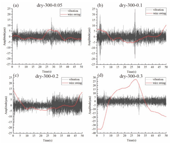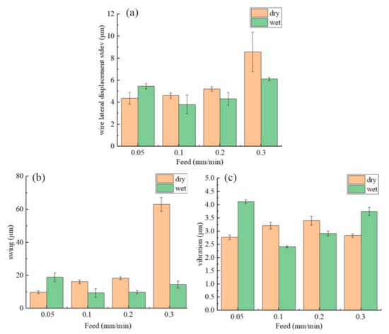 From Figure 7b,c, the variation trend for vibration and swing as the feed speed increased are clearer. The vibration for wet cutting with a 0.05 mm/min feed speed was the largest, even when compared to the dry cutting groups. As there was a balance between cutting efficiency and wire deflection, when the feed speed was only 0.05 mm/min, the wire was almost not deflected as shown in Figure 3. Therefore, the wire can vibrate freely even when a small cutting force was acted on the wire. But for much larger feed speeds, a larger wire bow was formed and, therefore, the vibration was slightly suppressed as the wire was tightly pressed onto the workpiece. Therefore, considering the special case for both the dry-300–0.3 group and the wet-300–0.05 group, it can be seen that the cutting force was not the only factor that can influence the vibration amplitude. When the wire bow deflection is too small, the vibration amplitude will increase heavily. But when the wire bow deflection is too large, the vibration will be suppressed as found in the dry cutting with 0.3 mm/min.