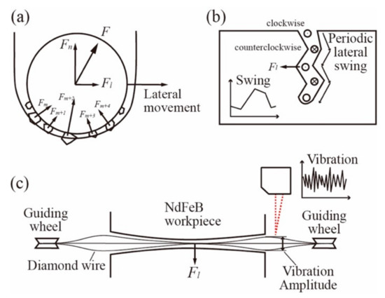 Figure 8 shows how the vibration and the swing motion were formed during the sawing process. During the sawing process, the total force acted on the wire constantly changed as a large amount of randomly distributed grit passes through the workpiece surface. Figure 8a shows the total force direction contributed by numerous grits with different grit positions and grit protrusions in a particular moment. It can be seen that the total force direction always deviated from the vertical direction by a small angle, resulting in a small lateral force acting on the wire and, henceforth, the lateral wire movement. However, as the total force direction changed frequently, the lateral movement direction also changed rapidly, resulting in a high-frequency vibration. Figure 8c shows the vibration of the wire at different locations and how the vibration amplitude could be recorded by the laser displacement sensor. The periodic lateral swing was also the result of the lateral sawing force, but the period for the swing strictly followed the reciprocating motion of the cutting wire. Therefore, the periodic lateral swing had nothing to do with the high-frequency change of the cutting force direction. Instead, the sawing machine’s assemble precision, especially the guiding wheel installation precision, should be considered the cause for the periodic swing of the wire. When the wire is cutting in different directions, due to the installation error of the guiding wheel, the stable wire’s position can be very different. Therefore, during the cutting process, there is always a periodic lateral force acting on the wire that changes direction as the wire cutting direction changes, creating such periodic waviness on the sample surface.