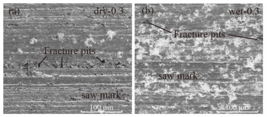 SEM images for (a) dry cutting and (b) wet cutting with a 0.3 mm/min feed speed.