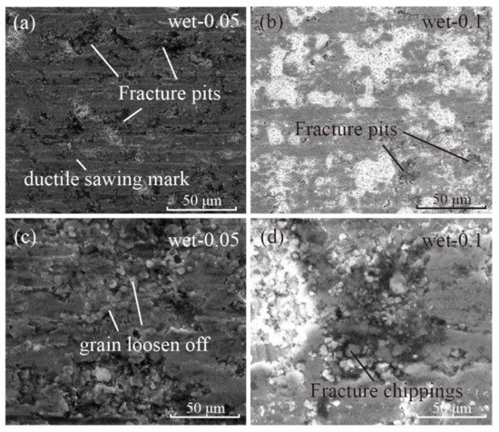 As for the influence of the feed speed, the surface was much rougher when the feed speed was larger. Even though the surface roughness Ra along the saw direction was slightly higher for the 0.05 group than for the 0.1 feed rate group, the surface morphology under SEM for these two groups was very different as shown in Figure 12. As shown in Figure 12, more cracks and fracture pits could be found under the microscope for the 0.05 group. However, the surface for the 0.1 mm/min group was flatter with more ductile removal marks. It can be seen from Figure 12c that NdFeB grains were loosened and started to fall off the surface, but for the 0.1 group, the fracture zone was smoother.