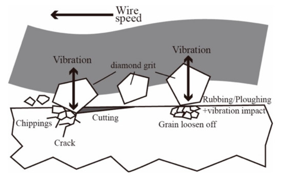 Vibration of the wire is considered a very important factor in diamond wire sawing. Tang et al. [5] used a laser vibration monitor to obtain the vibration during the diamond wire saw cutting process, and a vibration prediction model was established and verified. The result shows that a higher feed speed leads to higher cutting force, which induces a higher wire vibration amplitude. As a result, the surface roughness is also higher when the vibration amplitude increases. Huang et al. [6,7] found that higher wire speed, lower feed speed and higher wire tension can result in a much lower vibration amplitude. In his study, kerf loss was discovered to be higher when the vibration amplitude was higher. To analyze the vibration characteristics, Wang et al. [8] created a vibration model focusing on the prediction of the vibration frequency and amplitude. Andhare et al. [9] used a similar modeling method to construct a vibration model for the wire electric discharge machining process, and the result showed that the wire speed had little influence on the vibration frequency response. In the above studies, the vibration is considered a key parameter during the cutting process. However, how the vibration contributes to the waviness as well as the rough surface formation process is still unknown.
