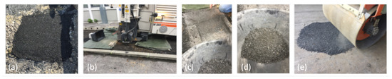 Preparation of the PU-RAP: (a) PU-asphalt pavement section on construction site. (b) Milling of the PU pavement. (c) View on the milled fractions after milling. (d) PU-RAP placed in bucket (e) Crushing of the PU-RAP by a roller compactor.