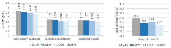 First, it can be stated that the bulk densities of the variants which were previously determined by calculation are confirmed by experimental testing according to TP Asphalt Part 6 [19].
