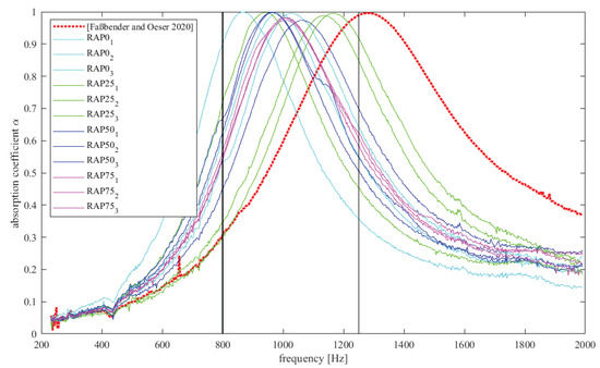 Looking at the samples tested in this study in Figure 4, it can be recognized that there is a scatter along the frequency range in the variants RAP0 (cyan), RAP25 (green) and RAP50 (magenta). Only the three test results of RAP75 (magenta) are stringent. In RAP25 and RAP75, in each case one measurement deviates slightly. It is found, however, that the curves move within the frequency range of 800 to 1250 Hz, which is an important frequency range for traffic noise according to [26] and can thus efficiently absorb and reduce traffic noise for human hearing [3].