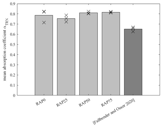 The absorption values are shown in Figure 5 as mean values in the form of bars. The markers show the individual results. As already indicated in Figure 4, it can be seen that the absorption capacity has increased, which could be due to the new composition with PU-RAP compared to the variant from [3]. Furthermore, it is noticed that the addition of the PU-RAP shows a slight positive trend, indicating that a higher absorption level is achieved with more PU-RAP added. However, this is a vague statement when considering the individual values.