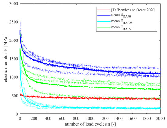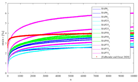 The deformation curves in Figure 6 describe the accumulated strains due to load application. As can be seen in Figure 6, the deformation curves of the investigated specimens lie in a strain range between 0 and about 6 ‰. It can be seen that variant RAP75 (75% PU-RAP) exhibits a more pronounced deformation behaviour, which is visible due to a stronger scatter of the individual results. All deformation curves follow an asymptotic trend along the entire testing period of 10,000 load cycles. No inflection point is visible in the deformation curve, which is usual for conventional asphalt. This fact indicates that no sudden failure of the specimens occurs during the loading process.
