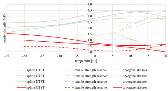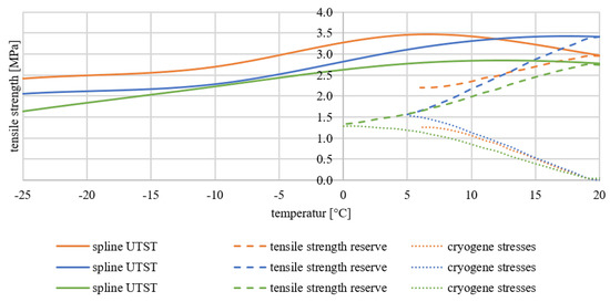 In Figure 10, it was recognized that in all TSRST of the variants RAP0 (orange), RAP25 (blue) and RAP50 (green), the resulting cryogenic stresses lead to early material failure. The samples were already damaged at temperatures starting at about 5 °C (RAP0 and RAP25). Variant RAP50 broke at a temperature of 0 °C. Thus, a tensile strength reserve is found here for all variants only in the temperature range between 5 °C or 0 °C and 20 °C.