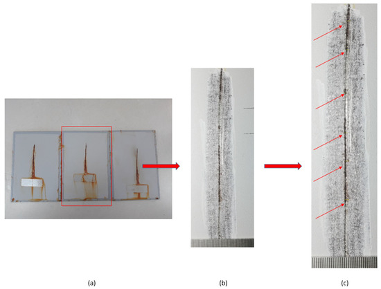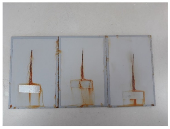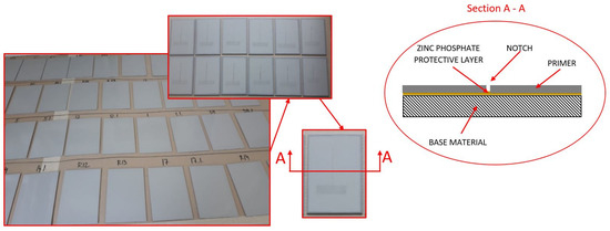 Testing of the notch corrosion was performed in accordance with the HRN EN ISO 4628-8 standard, and refers to the examination of protective properties. The test involves the assessment of coating deterioration, i.e., it determines the coating’s resistance to corrosion in certain service conditions. The test is carried out by removing the coating around the notch on the specimen after taking the specimens out of the salt-spray test chamber. There areas in which corrosion developed are detected, and the size of the corrosion product spread is measured at six points on the notch (Figure 7).