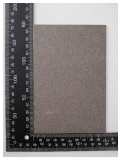 The specimens were cut to dimensions of 150 × 100 × 2 mm and mechanically treated with an abrasive jet, in order to achieve satisfactory quality of surface for the application of the protective coating. The surface was prepared according to the HRN EN ISO 12944-4 standard, with the required quality of Sa 2.5 according to the HRN ISO EN 8501-1 standard. As part of the visual inspection of the surface and comparison with the standard (etalon), the treated surface had a roughness in the range of 40–70 µm. The measuring of the roughness on each specimen was repeated 20 times, and then the mean value was calculated. Figure 2 shows the test sample after surface treatment with an abrasive jet.