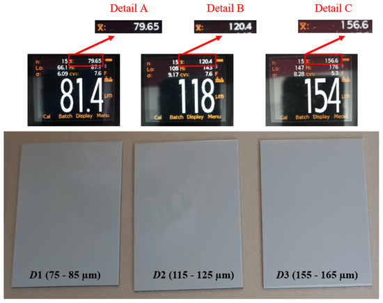 After inspecting the specimens’ surface quality, the next step was the application of the protective coating using airless spraying. The ratio of base and hardener was 5:1. As shown in Table 1, the dry-film thickness was varied at three levels: D1, D2, and D3. The dry-film thickness marked with D1 refers to specimens with a mean value ranging from 75 to 85 µm; D2 indicates specimens with a dry-film thickness mean value ranging from 115 to 125 µm; while D3 indicates specimens with a dry-film thickness mean value ranging from 155 to 165 µm. Figure 3 shows the test specimens after the application of the coating, with performed dry-film thickness measurements, to establish that everything is in accordance with the parameters defined by the test plan.