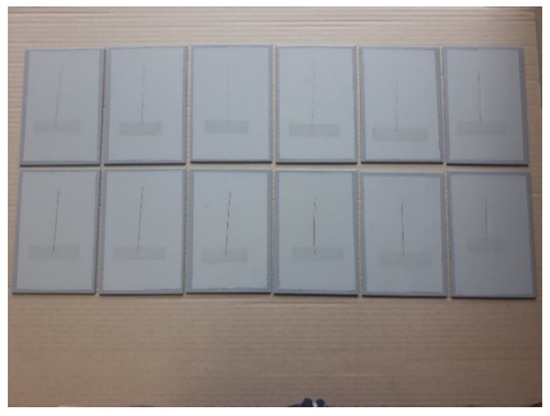 This experiment focused on testing the coating with a mean dry-film thickness of 120 µm, so the test time in the salt-spray test chamber was defined accordingly. Coatings of such characteristics and dry-film thickness are expected to have corrosion resistance in the C3 category, according to the coating manufacturer’s instructions, based on its characteristics and chemical composition. The duration of testing in the salt-spray test chamber for these characteristics in the coatings was 240 h, and was defined according to the norm HRN EN ISO 9227. Since the coating thickness is one of the input variables in this experiment, the values that were below and above the mean value in the same amount, then the remaining two time intervals for keeping specimens in the salt-spray test chamber, were defined for shorter and longer durations than the mentioned 240 h. Therefore, the time intervals for testing in the salt-spray test chamber were set to 120, 240, and 480 h. Before placing the specimens in the salt-spray test chamber, each specimen was subjected to a specific conditioning time after the coating was applied. In addition, a notch was incised in each specimen before placing them in the salt-spray test chamber. These specimens are presented in Figure 4. Figure 5 shows the test specimens inside the salt chamber workspace during the test, while Figure 6 shows the specimens after exposure to the salt-spray test chamber for a defined time interval.