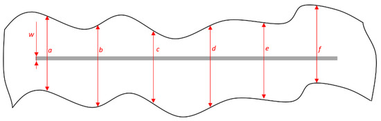 where the values a, b, c, d, e, and f refer to the measured values of the corrosion product spread in the area around the notch being affected by corrosion mechanisms; d1 refers to the mean value of measured sizes of corrosion spread around the notch; w refers to the width of initial notch; and d marks the value of notch corrosion.