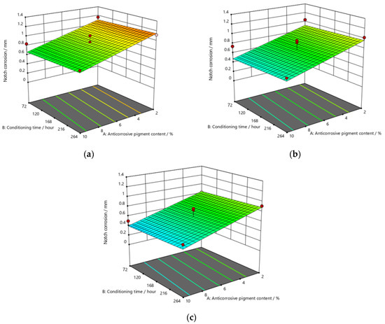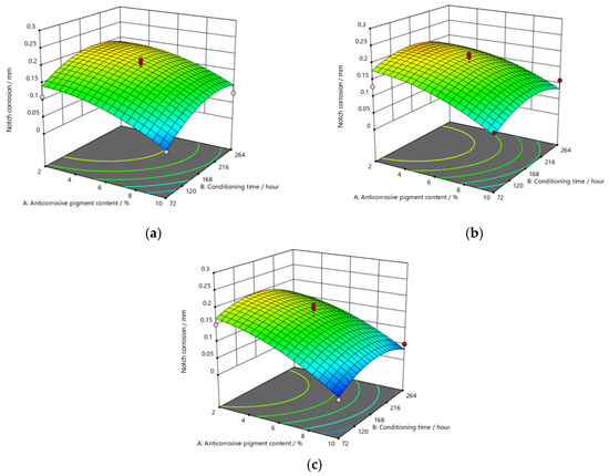 Response surface for regression model of notch corrosion for coating thickness of (a) D1, (b) D2, and (c) D3 values after 240 h in the salt-spray test chamber.