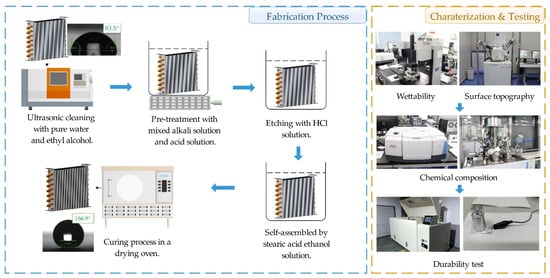 The Al fins were firstly pretreated in deionized water and ethanol for 10 min, respectively, with an ultrasonic cleaning machine (JP-020, Jiemeng, Shenzhen, China) to remove the surface impurities. Then, the fins were immersed in mixed alkaline solution and acid solution for 3 min under 45 °C, respectively, to further remove foreign matter. Next, etched the fins by HCl solution to obtain a micron-scale surface structure, and then rendered superhydrophobic by the self-assembly of stearic acid under room temperature. Finally, the curing process was carried out in a drying oven (WGL-45B, TAISITE, Tianjin, China) under 70 °C to 90 °C. The fabrication process is shown in Figure 1. The single-factor experiment concentrated on the concentration of HCl aqueous solution and the response surface method (RSM) were employed to investigate the influence of multiple variables [46], and to get a credible process with optimized parameters to fabricate the superhydrophobic Al alloy surface. Design EXPERT V8 was used for the RSM experimental design.