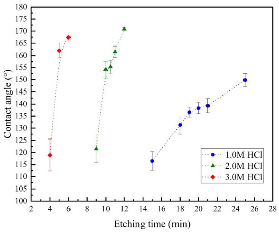 The concentration of aqueous HCl solution and the etching time are closely related to the etching degree of the Al sheet. If the etching degree is insufficient, a suitable micron-scale rough structure cannot be obtained. If the etching degree is too large, the mass of the Al sheet is seriously lost, causing a reduction in the mechanical strength and even the dissolution of the sample. In this experiment, we chose 1.0, 2.0, and 3.0 mol/L aqueous HCl solution. For 1.0 mol/L aqueous HCl solution, the etching times were 15, 18, 19, 20, 21, and 25 min. For 2.0 mol/L aqueous HCl solution, the etching times were 9, 10, 10.5, 11, and 12 min. For 3.0 mol/L aqueous HCl solution, the etching times were 4, 5, and 6 min. The maximum etching time was determined according to the extent of reaction of the Al sheet during the etching process. After the etching process, the samples were rinsed and dried. Then, they were immersed in a solution of 0.02 mol/L stearic acid and ethanol for deposition. After 24 h, the samples were thoroughly rinsed with deionized water and then dried in an oven at 80 °C for 30 min. The WCAs were measured after cooling the samples to room temperature. The results are shown in Figure 2.