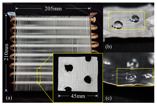 The surface modification of the full-size finned-tube heat exchanger was carried out using the optimized process. Figure 3a shows a superhydrophobic finned-tube heat exchanger. Dropped water droplets on the surface of the fins, as Figure 3b,c shows, the preparation method achieved success in full-size heat exchangers, and the hydrophobicity is significantly increased compared with ordinary bare Al fins.