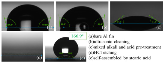 WCAs during the preparation process: (a) bare Al fin; (b) ultrasonic cleaning; (c) mixed alkali and acid pre-treatment; (d) HCl etching; (e) self-assembled by stearic acid.