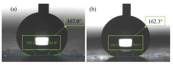 The static WCAs of the Al fins in each process during the fabrication were measured and are shown in Figure 4. Finally, the Al fin showed a static WCA of 166.9°. Figure 5 shows the snapshot of the advancing contact angle and receding contact angle, indicating a CAH of 3.7°, which meets the standards of super-hydrophobicity.