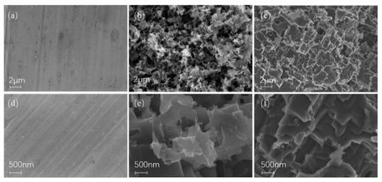 FE-SEM images during the fabrication process. 5000× magnification: (a) bare Al fin; (b) Al fin etched by HCl solution; (c) Al fin modified by stearic acid. 20,000× magnification: (d) bare Al fin; (e) Al fin etched by HCl solution; (f) fin modified by stearic acid.
