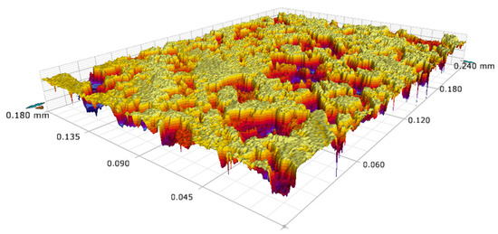 The surface morphology of the modified surface was investigated by FE-SEM at 10.00 kV with InLens signal. The FE-SEM images are shown in Figure 6. Figure 6a–c show the surface micro-topography of a bare Al fin, an Al fin etched by HCl solution, and an Al fin modified by stearic acid with 5000× magnification. It can be seen that after etching with an aqueous HCl solution, the relatively smooth surface of the original Al fin appeared with micron-level rough structures. Some small porous structures joined together to form irregular large dimples or grooves. Figure 6d–f display the corresponding images with 20,000× magnification. It can be observed that the micron-sized rectangular-shaped structures were constructed with diameters ranging from 0.5 to 1 μm. Comparing Figure 4b,e and Figure 4a,d, it is clear that micro-sized and nano-sized rough structures were constructed. These cavities with different sizes constituted a hierarchical structure on the Al surface, which is a prerequisite for the water repellency of the surface [49,50]. After the construction of the micro-nano structure, the low surface energy material was attached over the surface, as shown in Figure 4c,f, which made the surface superhydrophobic. The 3D topography of the surface also shows the micro-nano structure, as shown in Figure 7. The mean roughness (Ra) of the modified Al fin was 467.58 nm, and the root-mean-square roughness (Rq) was 595.14 nm. Meanwhile, the maximum peak-to-valley vertical distance (Rt) was 4.095 μm. With the self-assembly of a low surface energy substance, when a water droplet stays on the surface, this structure can provide space to keep the air in the hierarchical roughness. The SEM experiments agree with the calculated results obtained according to the Cassie-Baxter model.